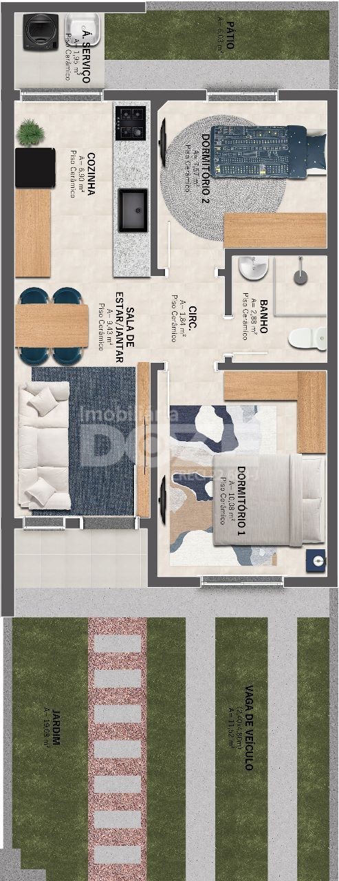Possuindo uma área total de 48,38m² privativos em um belo terreno de 114,60m², o imóvel é composto por: